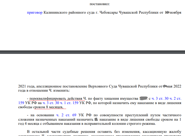 Осужден по ч. 4 ст. 159 УК РФ, ч. 4 ст. 160 УК РФ к наказанию: - по ч. 4 ст. 159 УК РФ к 4 годам лишения свободы; - по ч. 4 ст. 160 УК РФ к 4 годам лишения свободы. В соответствии с ч. 3 ст. 69 УК РФ путем частичного сложения назначенных наказаний, окончательно назначено В. наказание в виде 6 лет лишения свободы. приговор Автозаводского районного суда г. Тольятти Самарской области от 08 февраля 2021 года и апелляционное определение судебной коллегии по уголовным делам Самарского областного суда от 19 июля 2021 года в отношении В. в части осуждения за совершение преступления, предусмотренного ч. 4 ст. 160 УК РФ, отменить и прекратить уголовное дело в этой части на основании п. 2 ч. 1 ст. 24 УПК РФ. Приговор от февраля 2021 года и апелляционное определение судебной коллегии по уголовным делам Самарского областного суда от июля 2021 года в отношении В. в части осуждения за совершение преступления, предусмотренного ч. 4 ст. 160 УК РФ, отменить и прекратить уголовное дело в этой части на основании п. 2 ч. 1 ст. 24 УПК РФ. Приговор районного суда от февраля 2021 года и апелляционное определение судебной коллегии по уголовным делам Самарского областного суда от июля 2021 года в отношении В. изменить: исключить указание о назначении В. окончательного наказания в соответствии с ч. 3 ст. 69 УК РФ; считать В. осужденным по ч. 4 ст. 159 УК РФ к